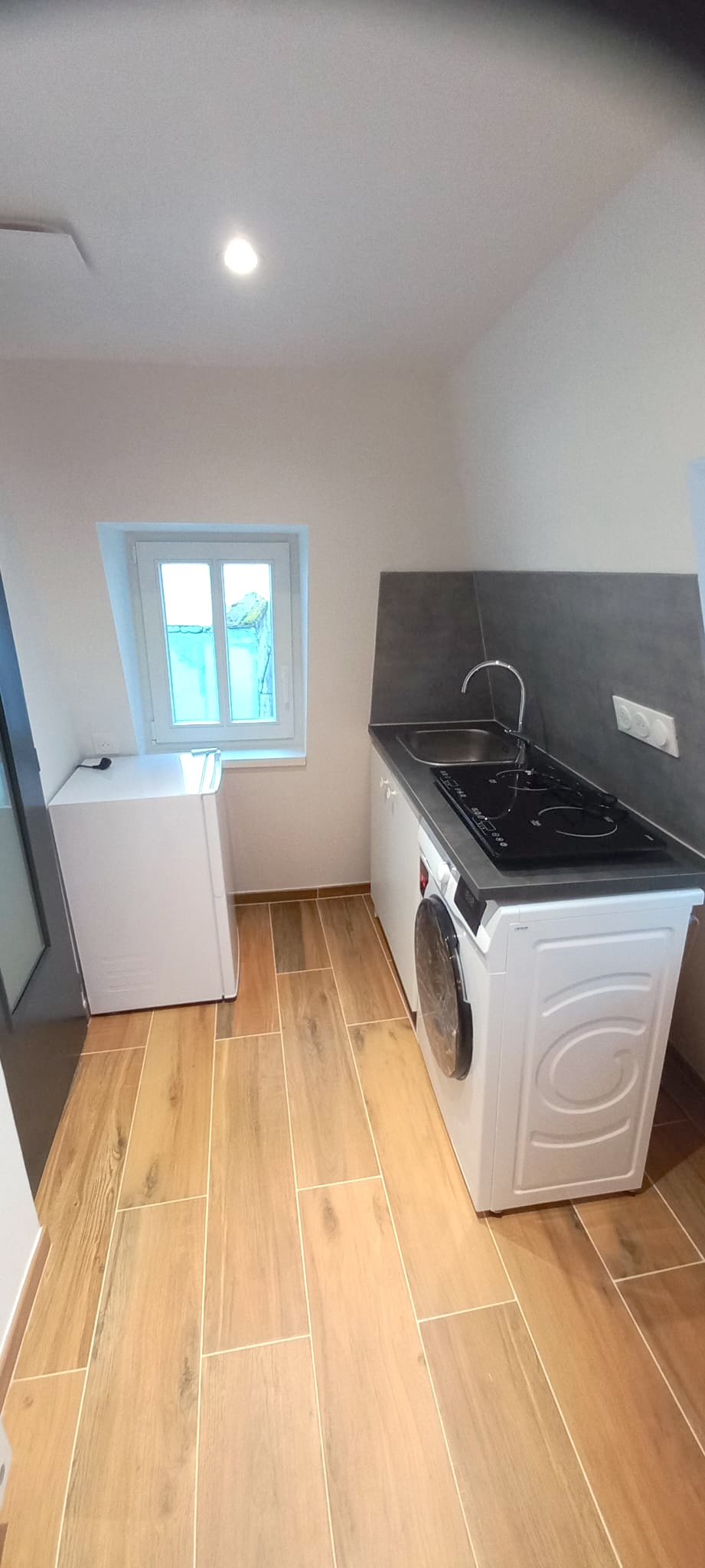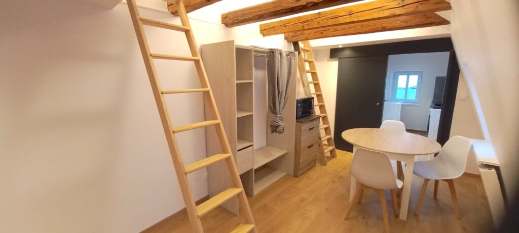 d’une entrée avec rangement, d’une pièce de vie avec canapé lit, table basse, d’un espace séjour compose d’une table de 3 chaises , de rangements, d’une cuisine offrant une plaque 2 feux vitrocéramique, une machine à laver, un réfrigérateur-freezer et une salle d’eau avec meuble vasque, douche et WC