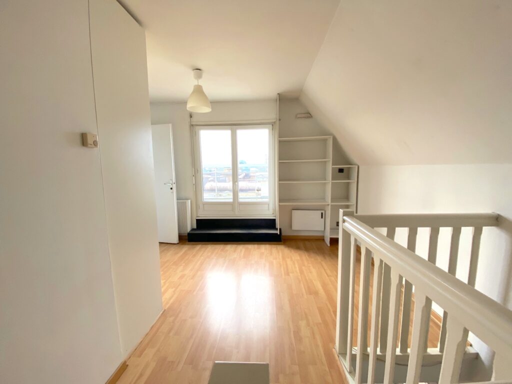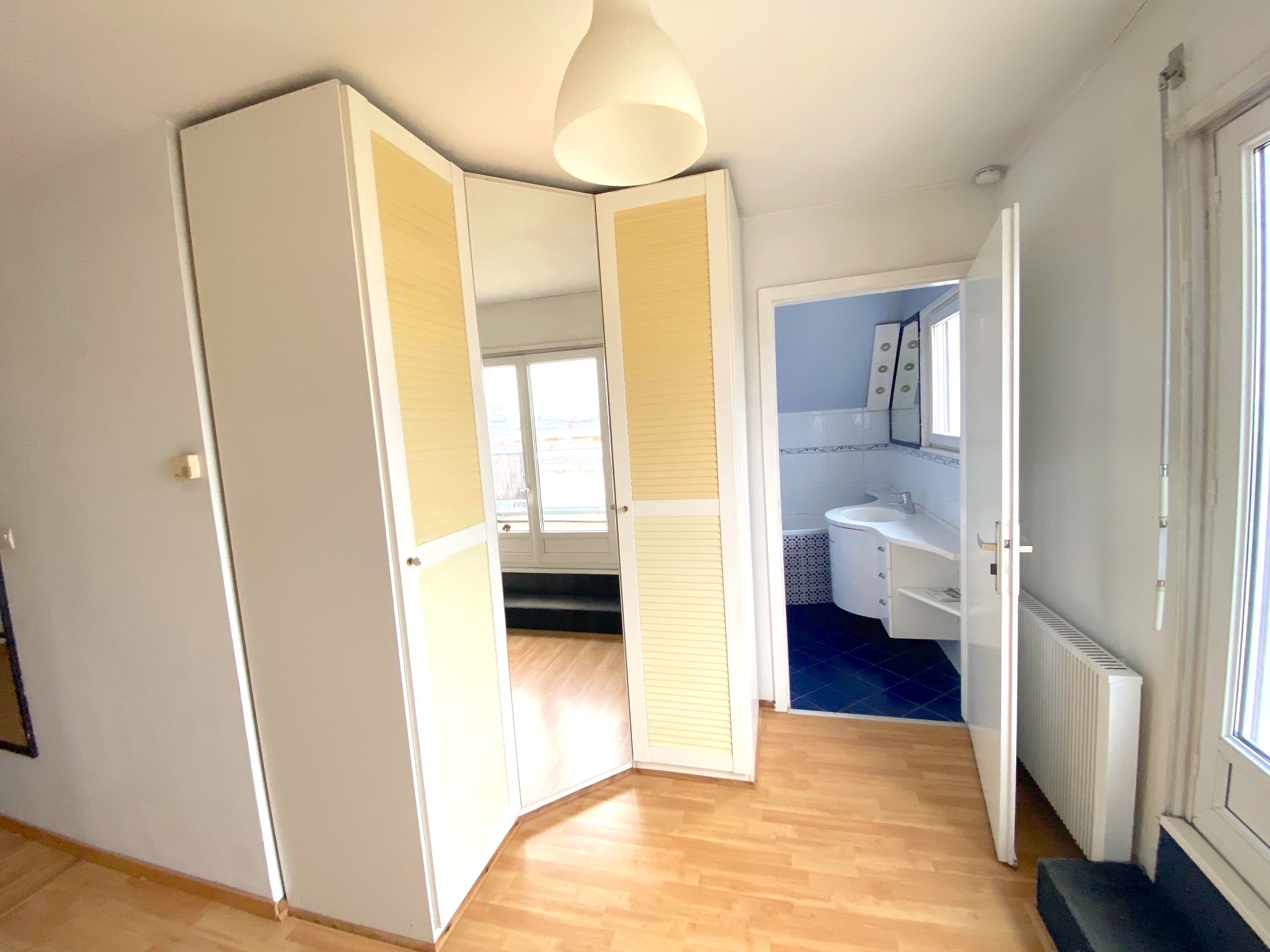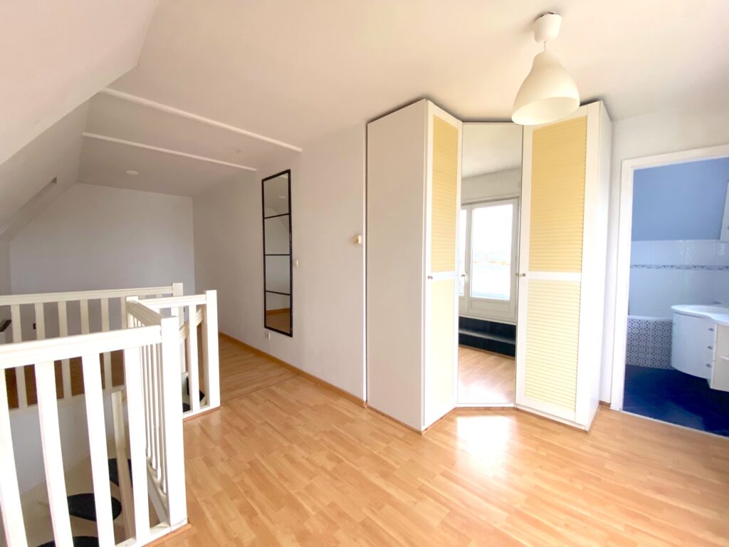 A l’étage, une partie nuit pouvant accueillir un lit double, un emplacement bureau avec penderie intégrée ouverte sur une grande terrasse( 13,65m2)et une salle de bain avec baignoire.