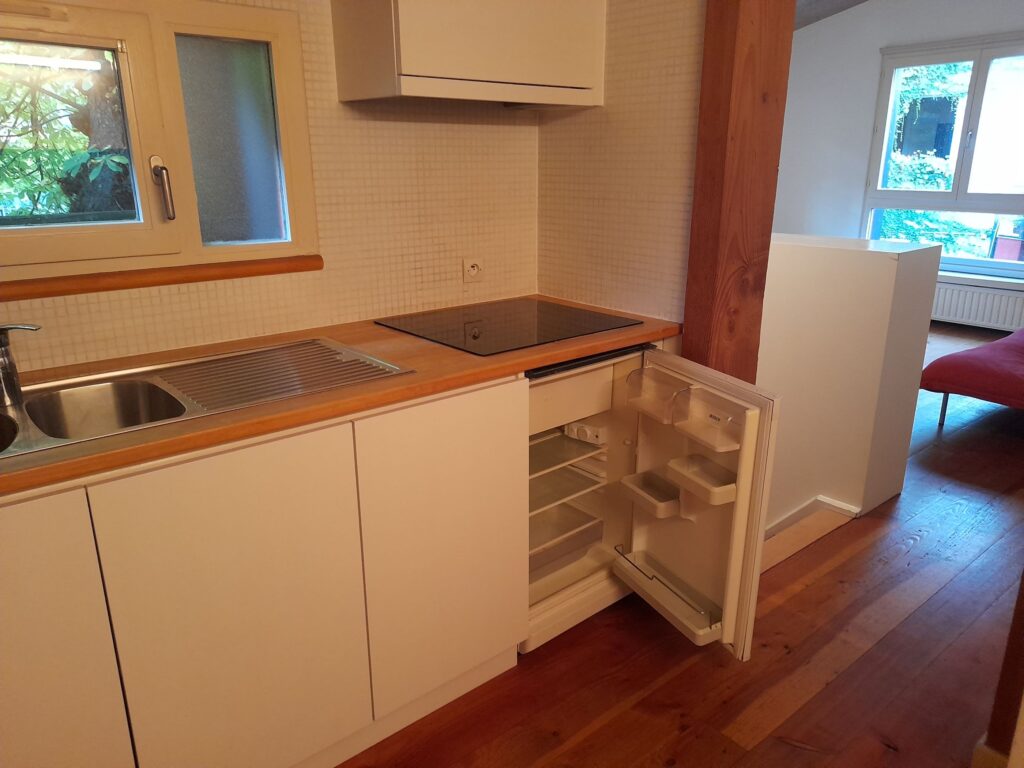 A l’étage un salon donnant sur une petite terrasse, une cuisine meublée équipée d’un petit frigidaire, une plaque vitrocéramique, une hotte.