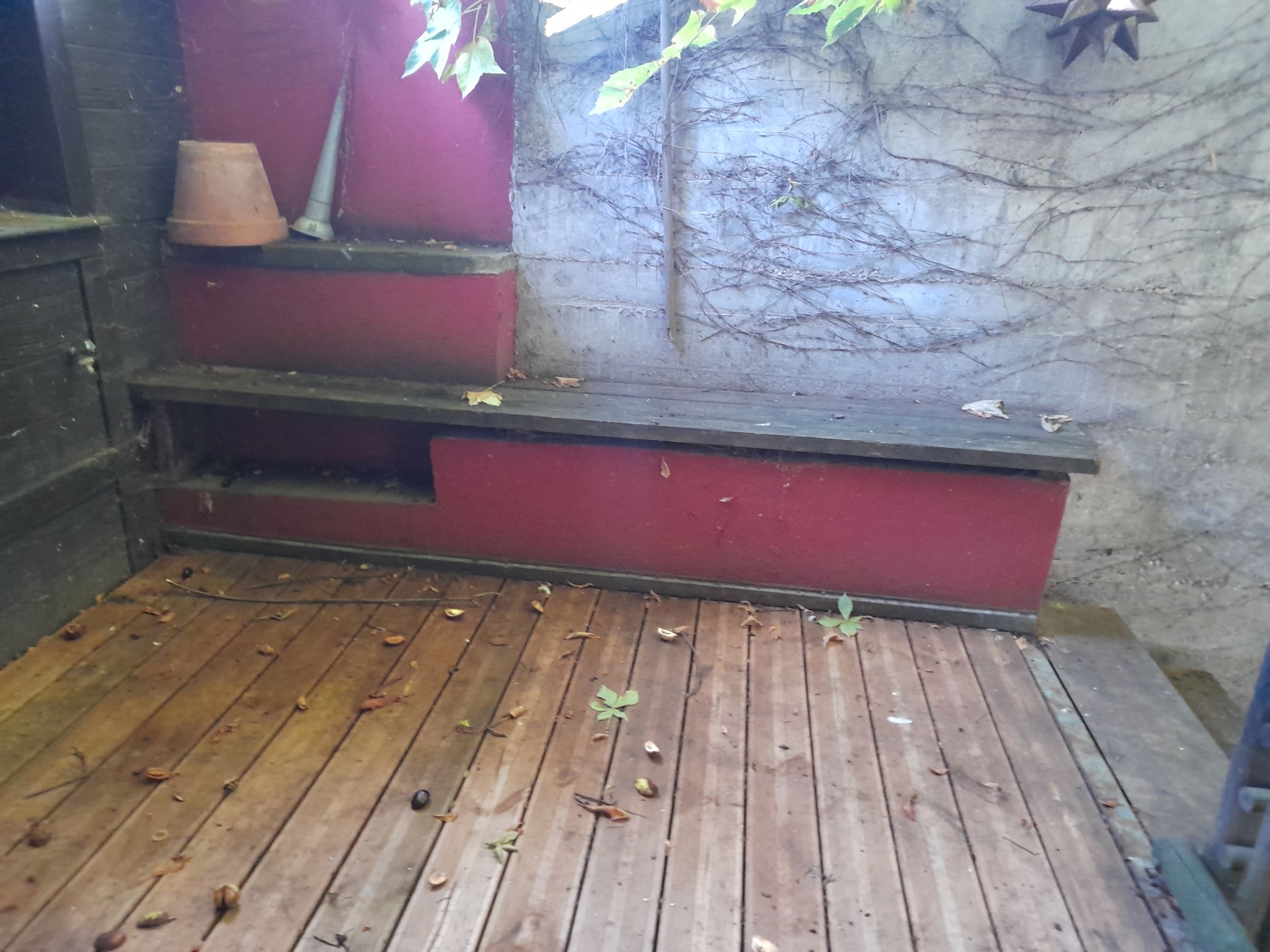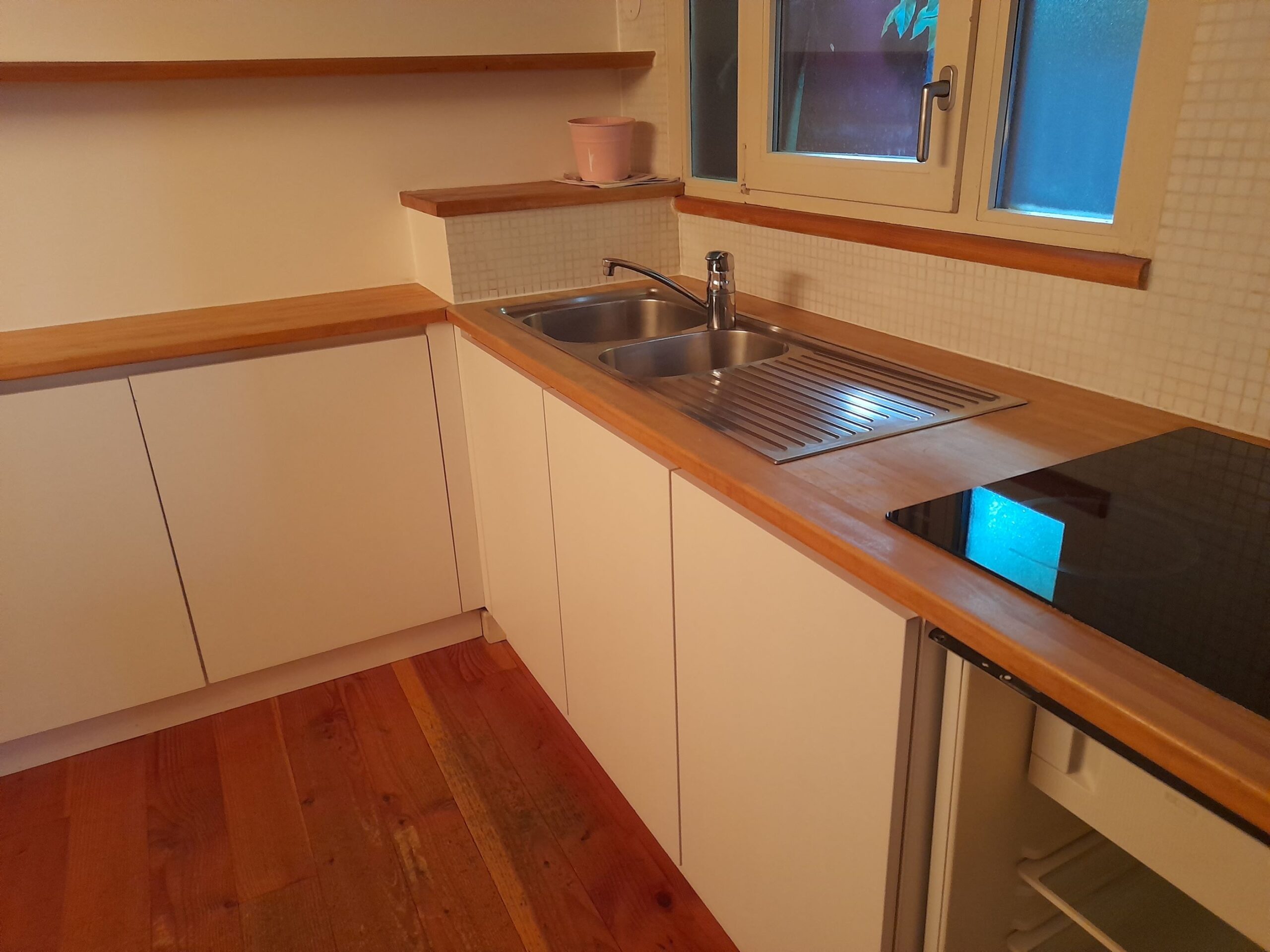 A l’étage un salon donnant sur une petite terrasse, une cuisine meublée équipée d’un petit frigidaire, une plaque vitrocéramique, une hotte.